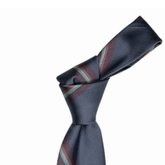 Tie - Dusty Blueish Gray w/ Maroon, Rose, Turquoise and Yellow Stripe