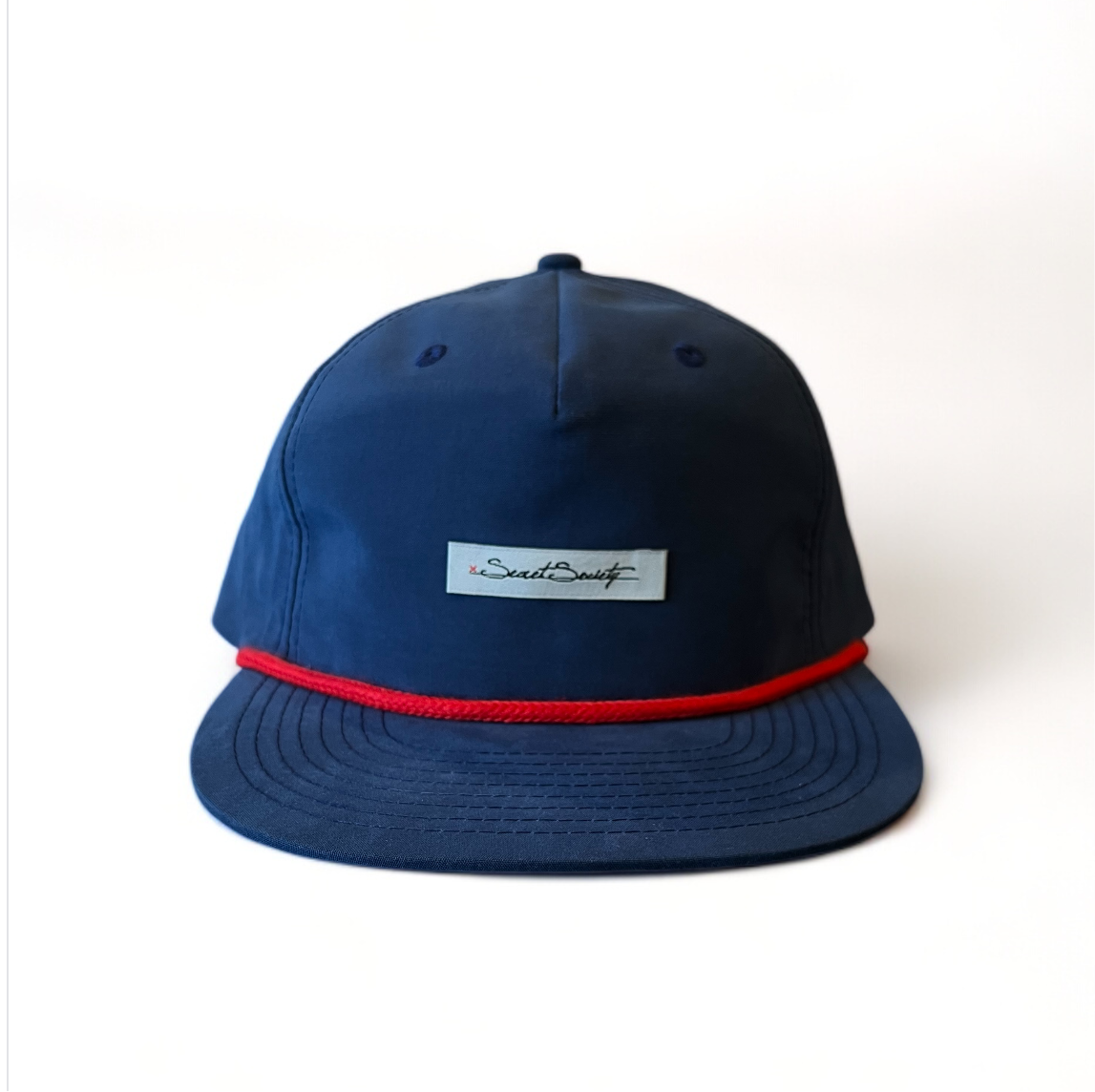 Navy hat with red rope and navy snapback closure, with our signature hand bar tacked red X.
